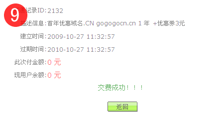 9、已交費(fèi),點(diǎn)擊“返回”查看域名。