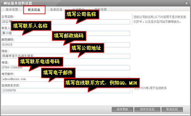 聯(lián)系信息主要填寫(xiě)公司名稱(chēng)聯(lián)系人、郵政編碼、地址、電話(huà)電子郵件、線(xiàn)聯(lián)系方式,填寫(xiě)完后記得點(diǎn)擊保存更新。