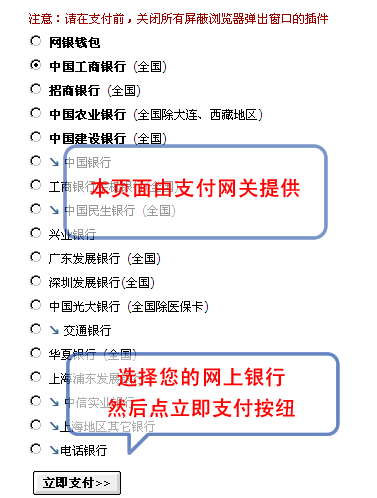 4、選擇您的網(wǎng)上銀行,該頁面由支付網(wǎng)關提供