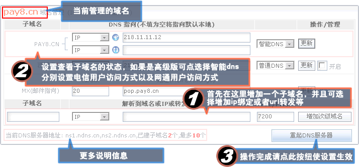 | 以下操作均以pay8.cn做為示例域名,請操作時結(jié)合自己的域名 域名申請成功后,默認(rèn)有www.pay8.cn,pay8.cn兩個域名設(shè)置記錄,以及一個泛域名設(shè)置記錄。 1、如果要設(shè)置pay.cn/www.pay8.cn的解析,請在對應(yīng)的文本框中輸入解析的ip地址,或者選擇cname以及轉(zhuǎn)發(fā)等分別設(shè)置 2、泛域名設(shè)置,要設(shè)置泛域名解析,請勾選泛域名記錄行后的“開啟”復(fù)選框即可設(shè)置泛域名功能 3、要設(shè)置其它的子域名,請在最下的文本框輸入子域名,并選擇解析或者轉(zhuǎn)發(fā)等,再設(shè)置好具體的地址后點“增加子域名”按扭既可增加成功,也可在增加成功后修改解析或者轉(zhuǎn)發(fā)地址。 4、高級版本的DNS管理系統(tǒng)具有智能DNS解析功能,增加子域名后,既可選擇智能DNS功能,此時同一個子域名就有“電信”和“網(wǎng)通”兩個不同的設(shè)置選項,您可以有針對的分別設(shè)置。 |