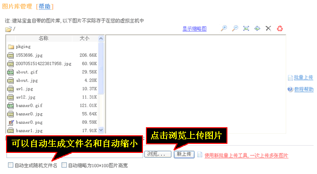 點擊“瀏覽上傳圖片,左下角可以選擇“自動生成隨機(jī)文件名”和“自動縮小為100*100比例”。右上角可以對圖片進(jìn)行放大、縮小、顯示最合適比例、刪除清空等操作。