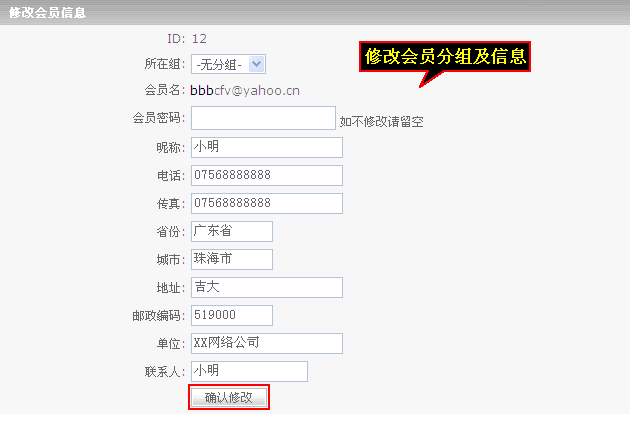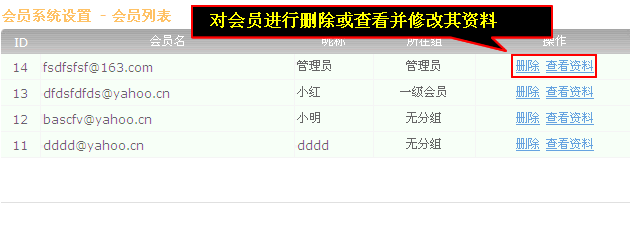 點擊“刪除”可以刪除會員,點擊“查看資料”可以對會員的資料進行修改及密碼修改。